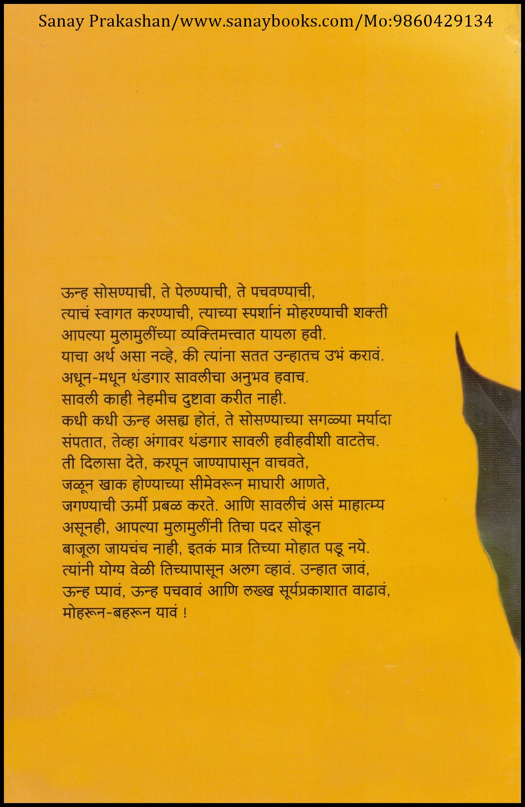 ऊन्ह सोसण्याची, ते पेलण्याची, ते पचवण्याची, त्याच स्वागत करण्याची, त्याच्या स्पर्शानं मोहरण्याची शक्ती आपल्या मुलामुलींच्या व्यक्तिमत्वात यायला हवी. याचा अर्थ असा नव्हे, कि त्यांना सतत उन्हातच उभं करावं. अधून- मधून थंडगार सावलीचा अनुभव हवाच. सावली काही नेहमीच दुष्टावा करीत नाही. कधी कधी ऊन्ह असह्य होतं, ते सोसण्याचा सगळ्या मर्यादा संपतात, तेव्हा अंगावर थंडगार सावली हवीहवीशी वाटतेच. ती दिलासा देते, करपून जाण्यापासुन वाचवते, जळून खाक होण्याच्या सीमेवरून माघारी आणते, जगण्याची उर्मी प्रबळ करते. आणि सावलीच असं माहात्म्य असूनही, आपल्या मुलामुलींनी तिचा पदर सोडून बाजूला जायचंच नाही, इतकं मात्र तिच्या मोहात पडू नये. त्यांनी योग्य वेळी तिच्यापासून अलग व्हावं. उन्हात जावं, ऊन्ह प्यावं, ऊन्ह पचवावं आणि लख्ख सूर्यप्रकाशात वाढावं, मोहरून – बहरून यावं !