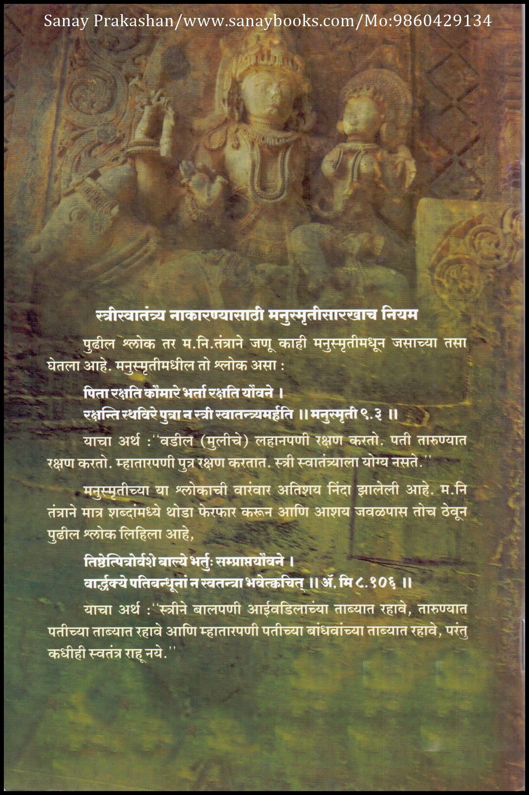 याचा अर्थ : ”स्त्रीने बालपणी आईवडिलांच्या ताब्यात रहावे आणि म्हातारपणी पतीच्या बांधवांच्या ताब्यात रहावे, परंतु स्वतंत्र राहू नये. ”